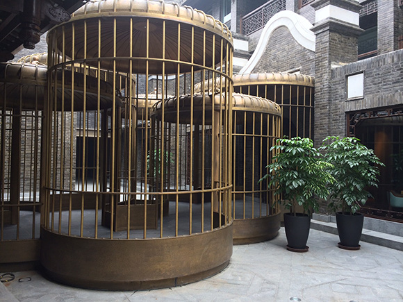 鸟笼的灯光控制,由三个4路调光模块,一个4路开闭模块,一个8键控制面板完美结合,组合不同的灯光场景。不同的场景组合营造出不同的灯光效果,给整个酒店增添别具一格的夜晚景色。